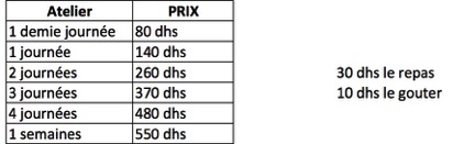 Tabadoul vous propose de les occuper de 10h30 à 16h du lundi au vendredi, par des activités créatives et de mouvement, de quoi élargir leurs horizons pendant ces vacances d’automne. Le déjeuner (30dhs) et le gouter (10dhs) faits maison par Aziza seront servis sur place aux participants.